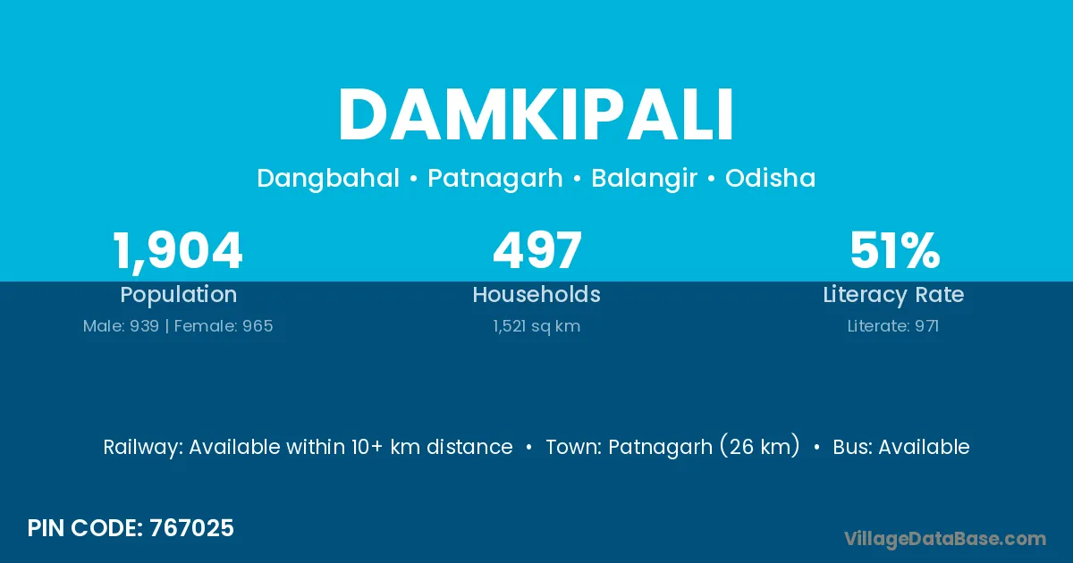 Patnagarh (26 km) is the nearest town to Damkipali village for major economic activities and is located approximately 26 km away.