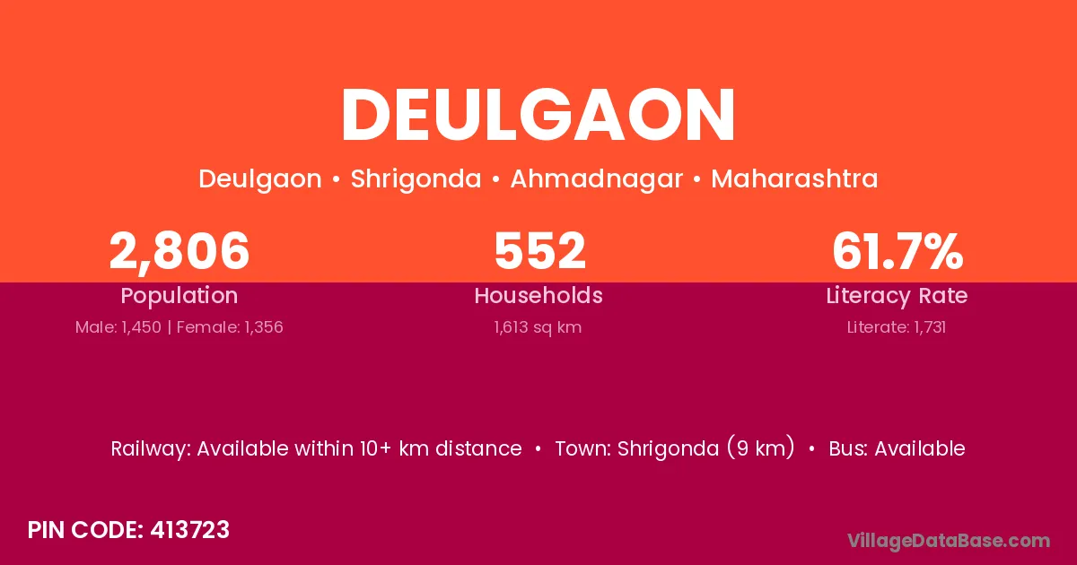 Patnagarh (13 km) is the nearest town to Deulgaon village for major economic activities and is located approximately 13 km away.
