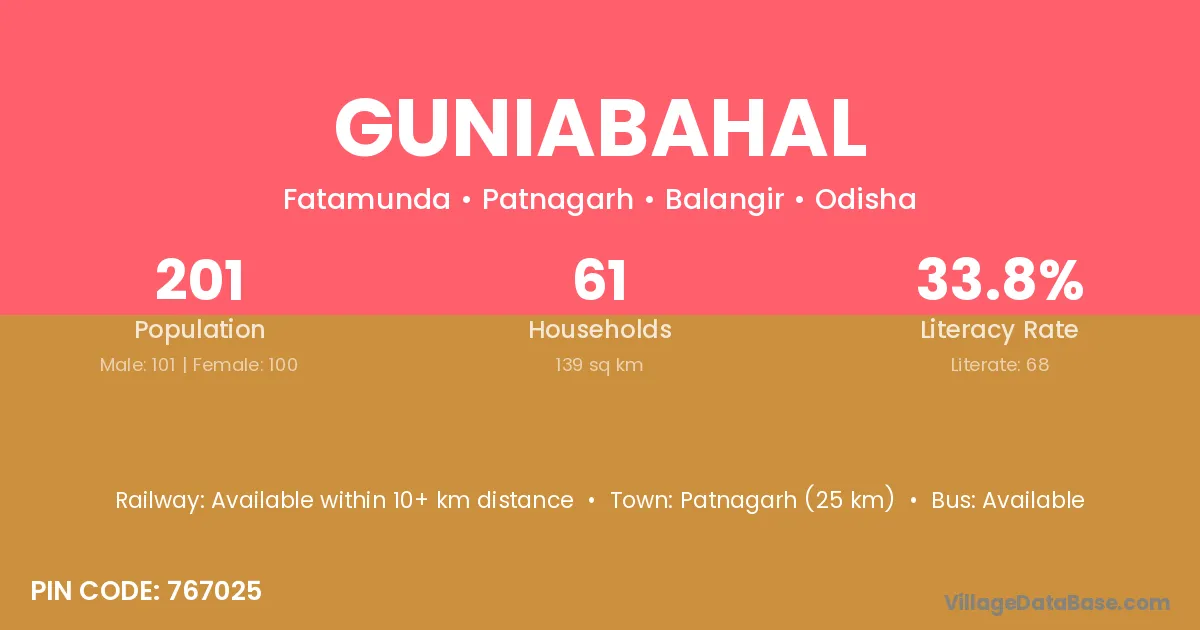 Guniabahal village has a total population of 201 people, of which 101 are males and 100 are females.