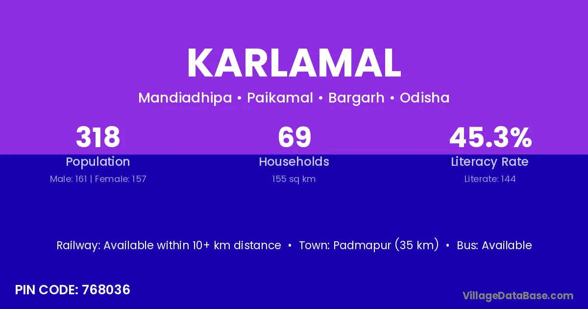 Patnagarh (13 km) is the nearest town to Karlamal village for major economic activities and is located approximately 13 km away.