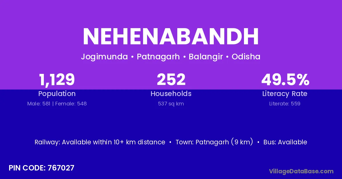 Patnagarh (9 km) is the nearest town to Nehenabandh village for major economic activities and is located approximately 9 km away.