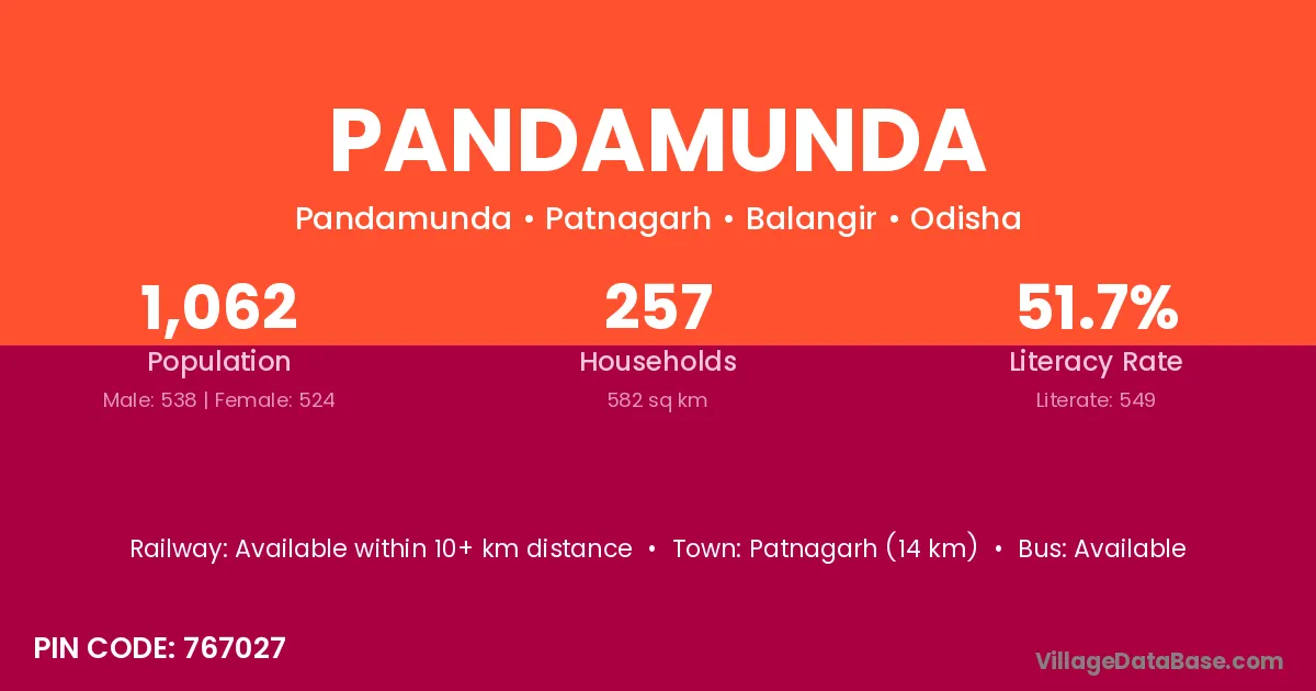 Pandamunda village has a total population of 1,062 people, of which 538 are males and 524 are females.