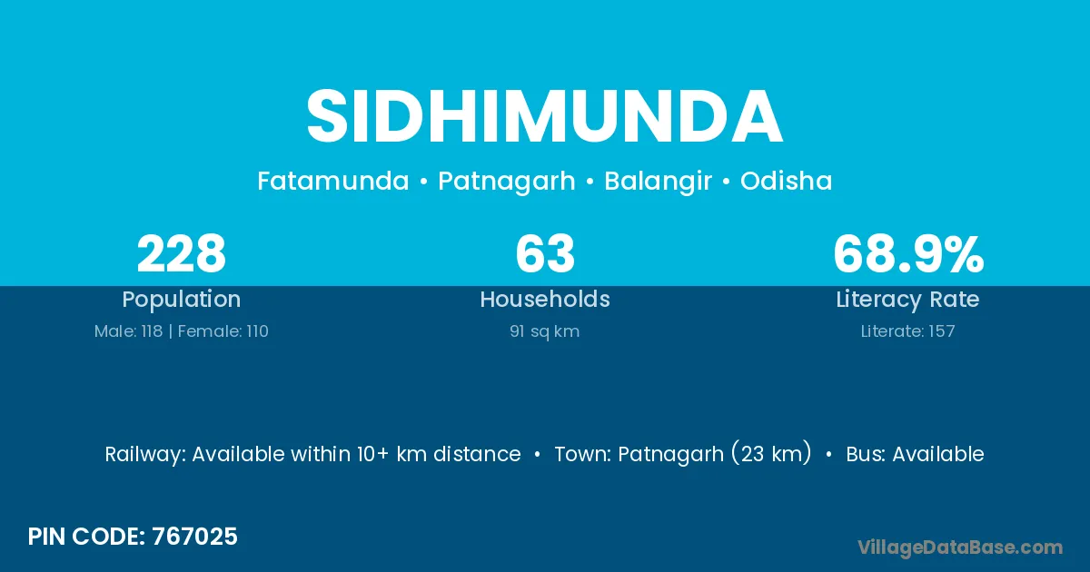 Patnagarh (23 km) is the nearest town to Sidhimunda village for major economic activities and is located approximately 23 km away.