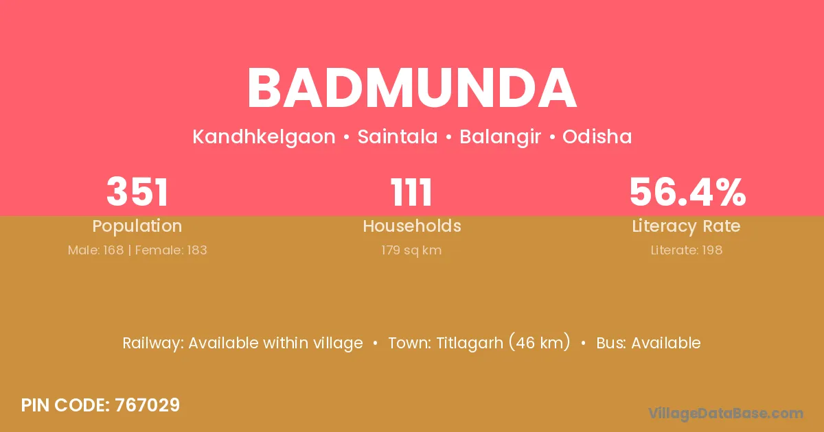 Titlagarh (46 km) is the nearest town to Badmunda village for major economic activities and is located approximately 46 km away.