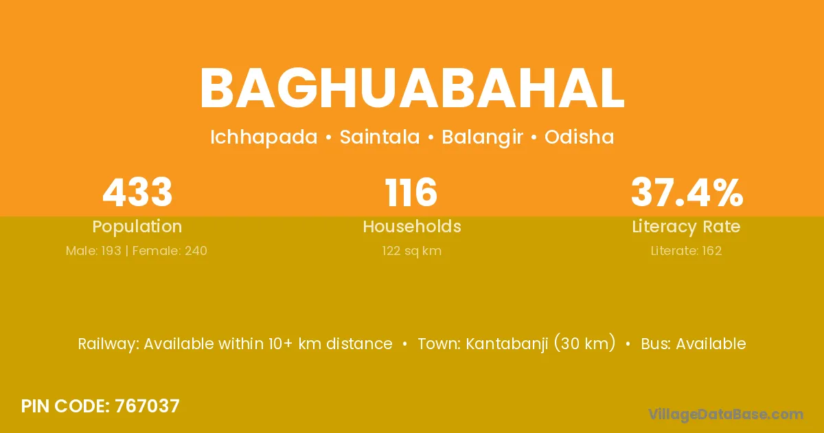Kantabanji (30 km) is the nearest town to Baghuabahal village for major economic activities and is located approximately 30 km away.