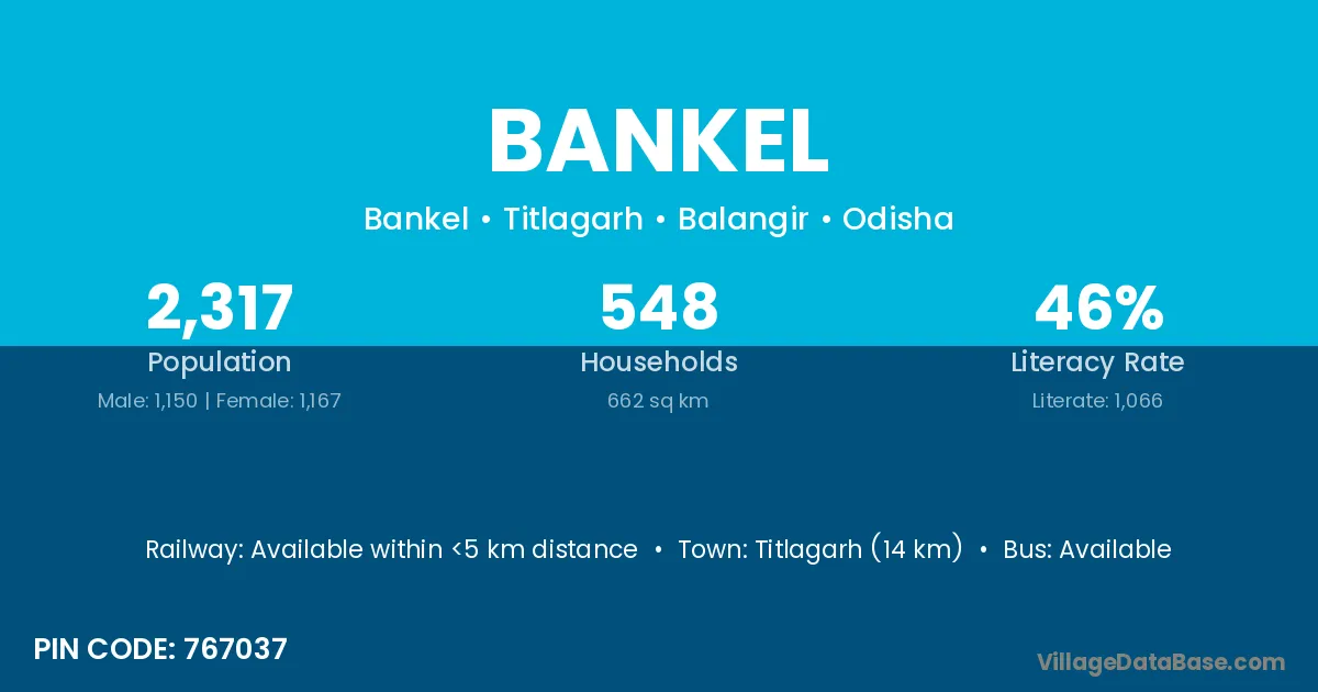 Kantabanji (20 km) is the nearest town to Bankel village for major economic activities and is located approximately 20 km away.