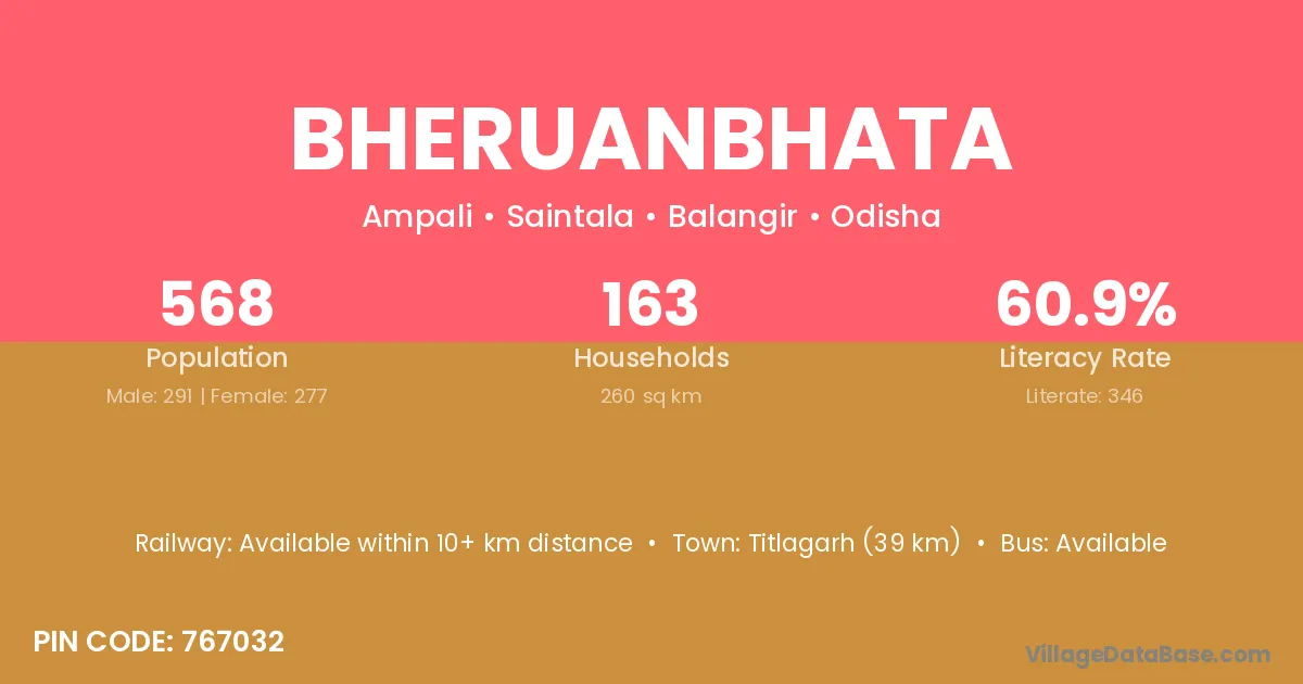 Titlagarh (39 km) is the nearest town to Bheruanbhata village for major economic activities and is located approximately 39 km away.