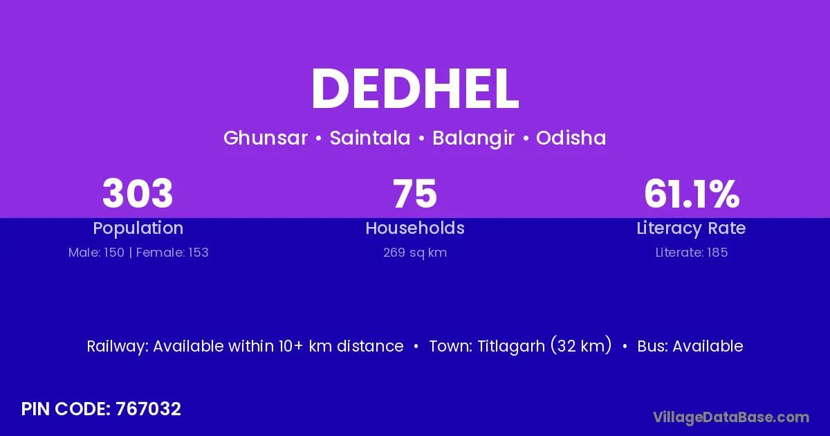 Titlagarh (32 km) is the nearest town to Dedhel village for major economic activities and is located approximately 32 km away.