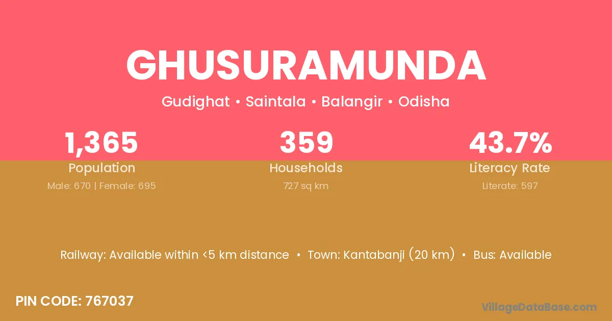 Ghusuramunda village has a total population of 1,365 people, of which 670 are males and 695 are females.