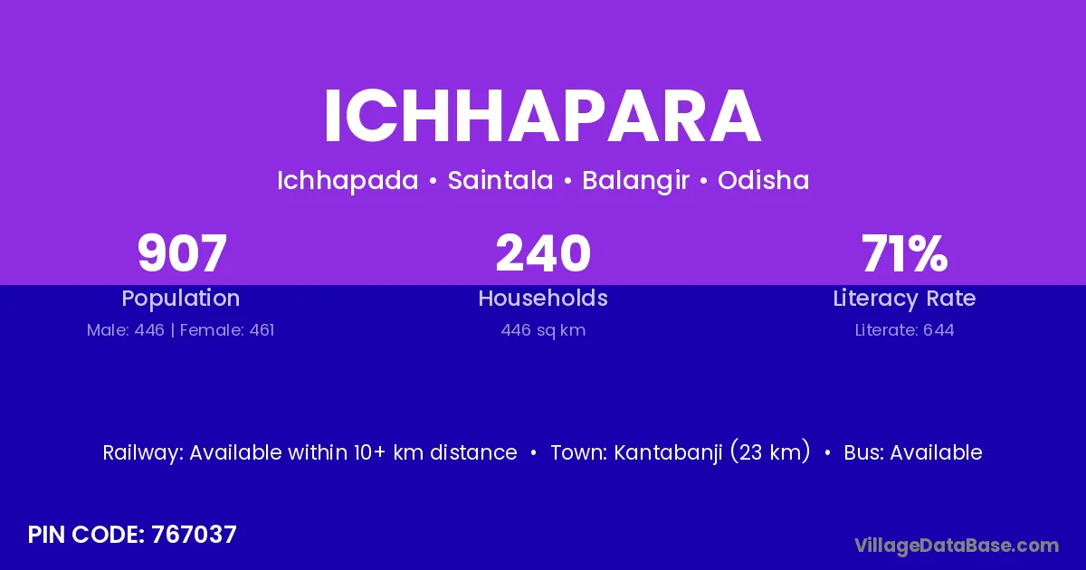 Kantabanji (23 km) is the nearest town to Ichhapara village for major economic activities and is located approximately 23 km away.