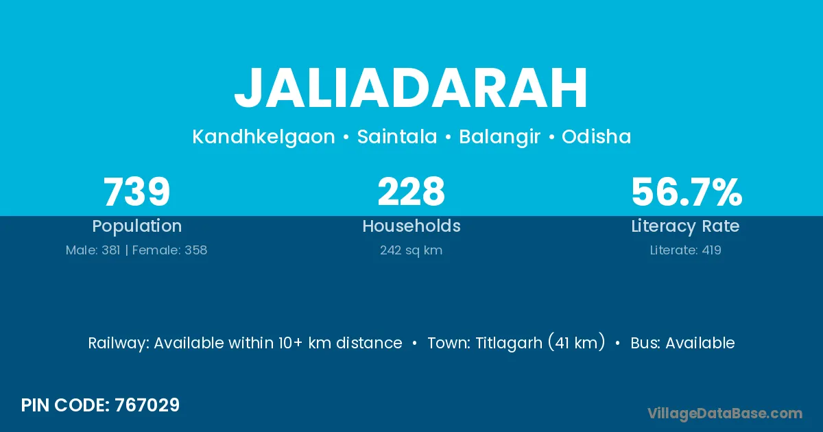 Titlagarh (41 km) is the nearest town to Jaliadarah village for major economic activities and is located approximately 41 km away.