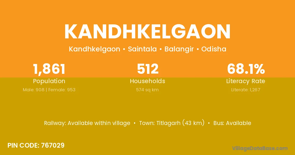 Titlagarh (43 km) is the nearest town to Kandhkelgaon village for major economic activities and is located approximately 43 km away.