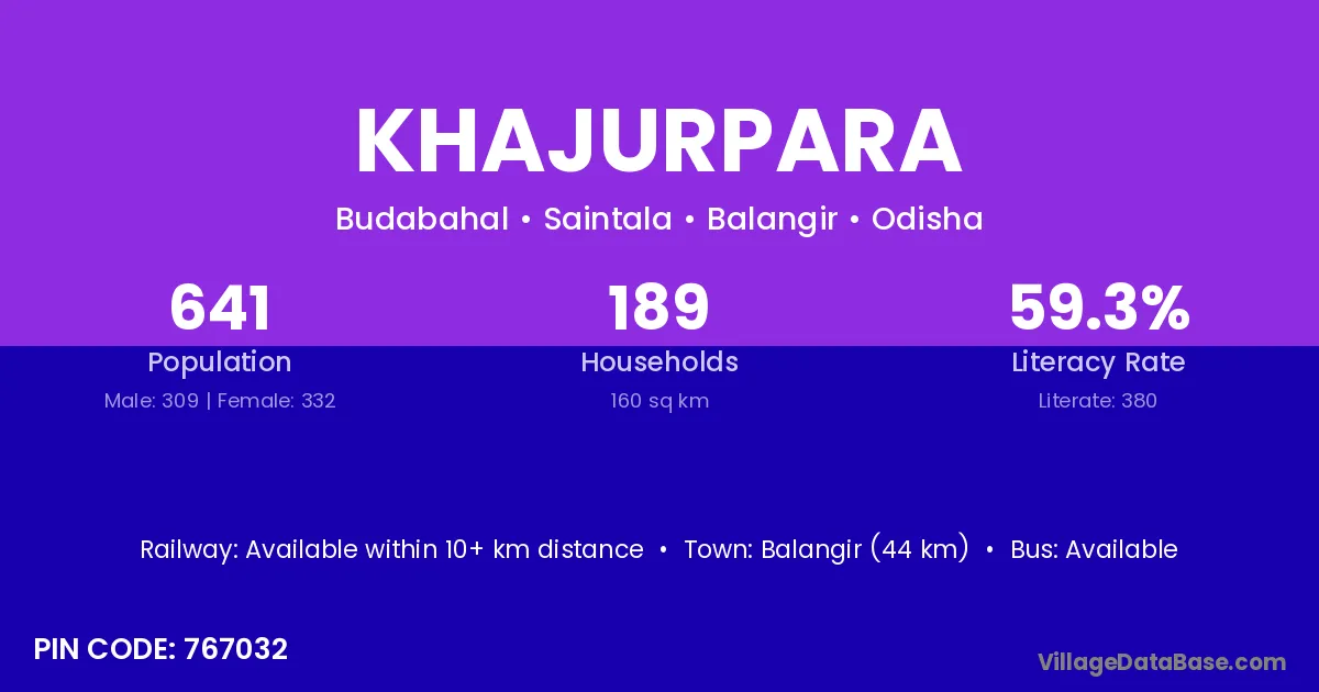 Khajurpara village has a total population of 641 people, of which 309 are males and 332 are females.
