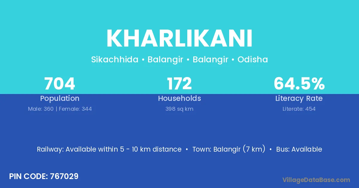 Titlagarh (39 km) is the nearest town to Kharlikani village for major economic activities and is located approximately 39 km away.