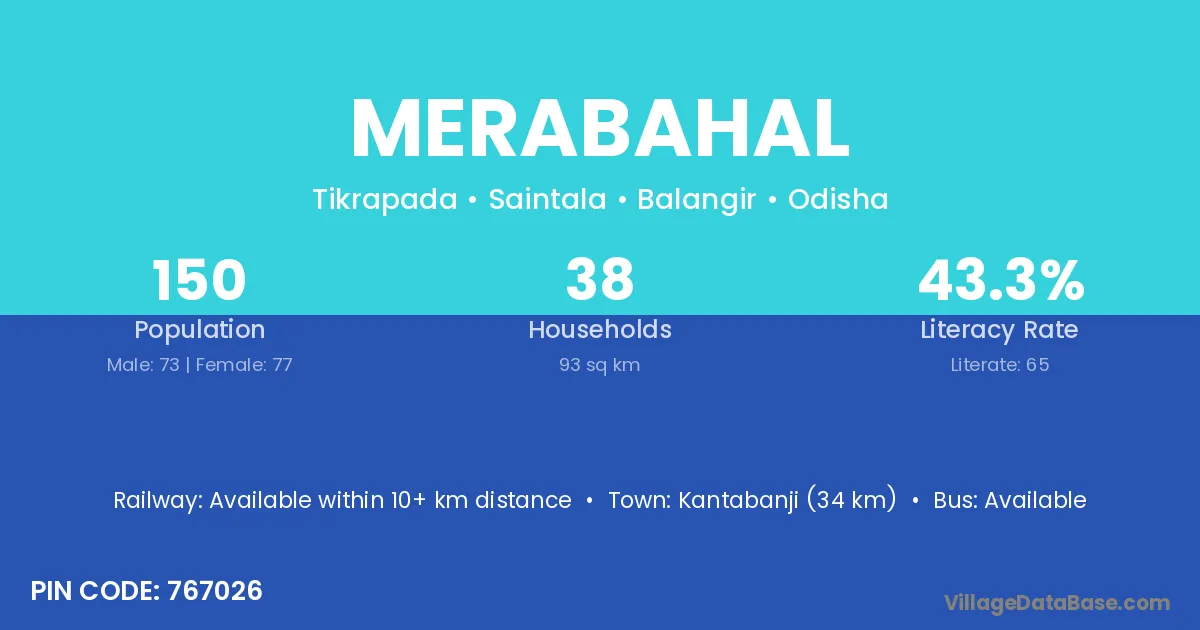 Kantabanji (34 km) is the nearest town to Merabahal village for major economic activities and is located approximately 34 km away.