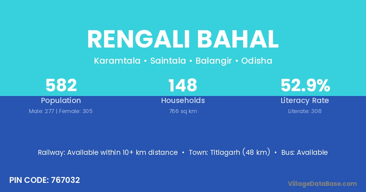 Titlagarh (48 km) is the nearest town to Rengali Bahal village for major economic activities and is located approximately 48 km away.