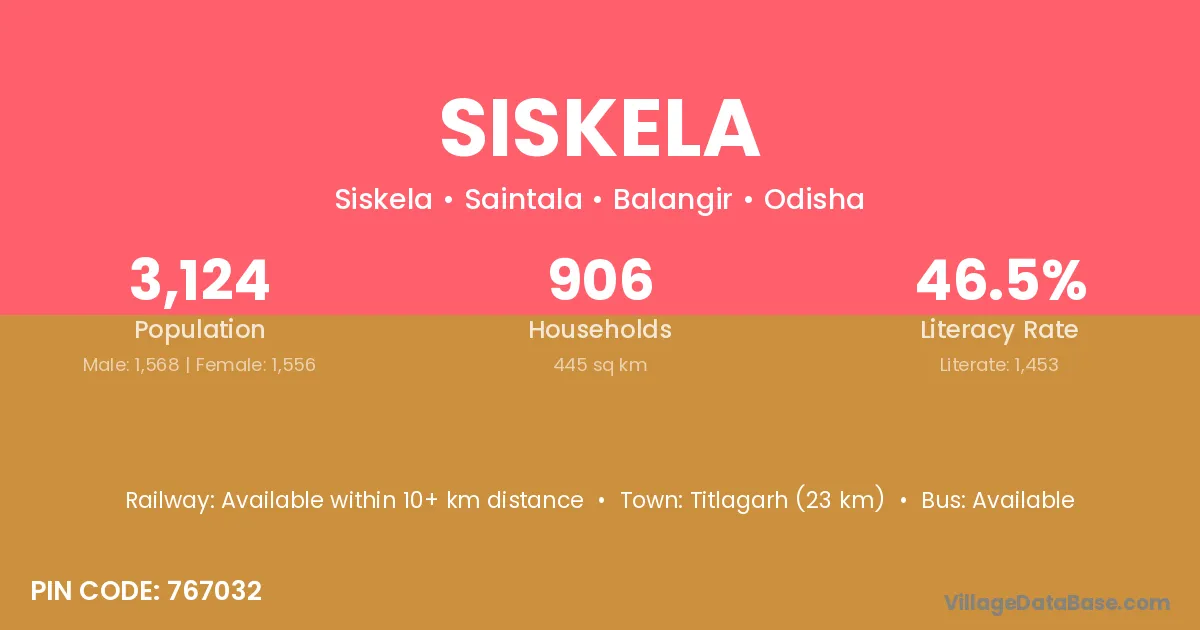 Titlagarh (23 km) is the nearest town to Siskela village for major economic activities and is located approximately 23 km away.