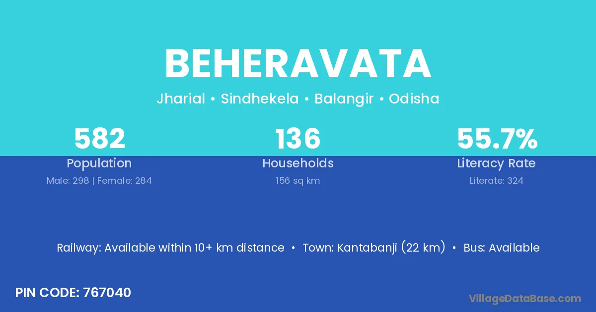 Kantabanji (22 km) is the nearest town to Beheravata village for major economic activities and is located approximately 22 km away.