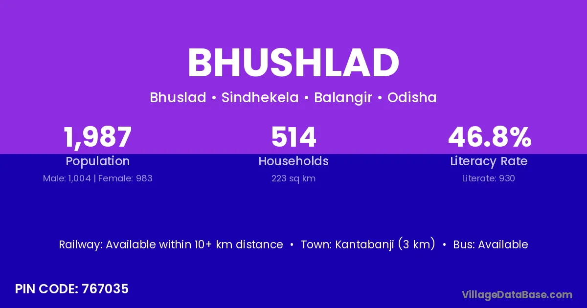 Kantabanji (3 km) is the nearest town to Bhushlad village for major economic activities and is located approximately 3 km away.