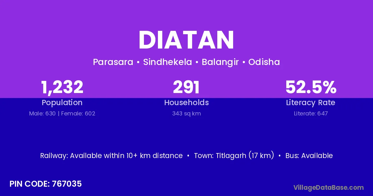 Titlagarh (17 km) is the nearest town to Diatan village for major economic activities and is located approximately 17 km away.
