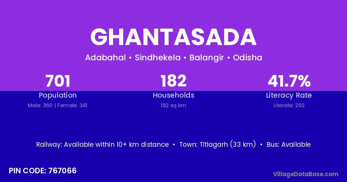 Titlagarh (33 km) is the nearest town to Ghantasada village for major economic activities and is located approximately 33 km away.