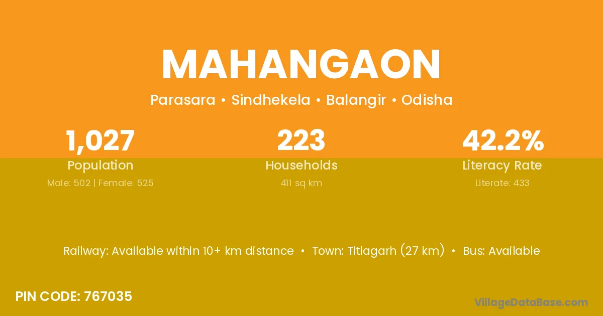Titlagarh (27 km) is the nearest town to Mahangaon village for major economic activities and is located approximately 27 km away.