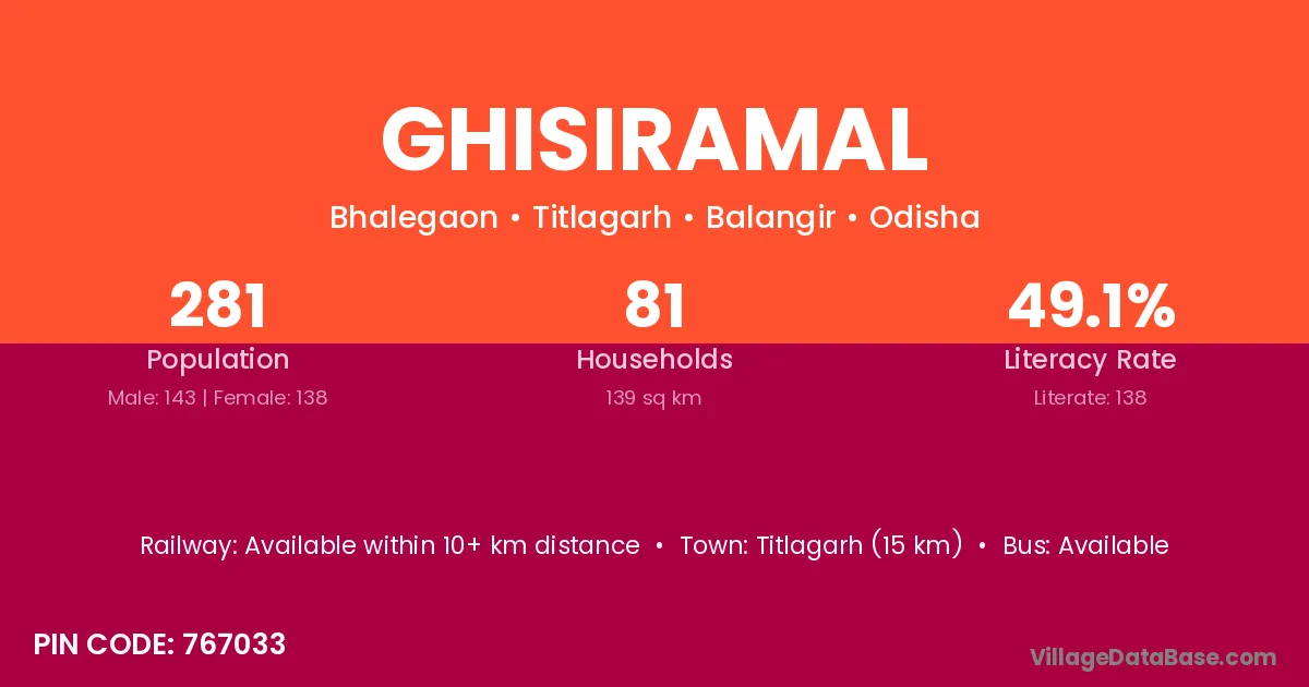 Titlagarh (15 km) is the nearest town to Ghisiramal village for major economic activities and is located approximately 15 km away.