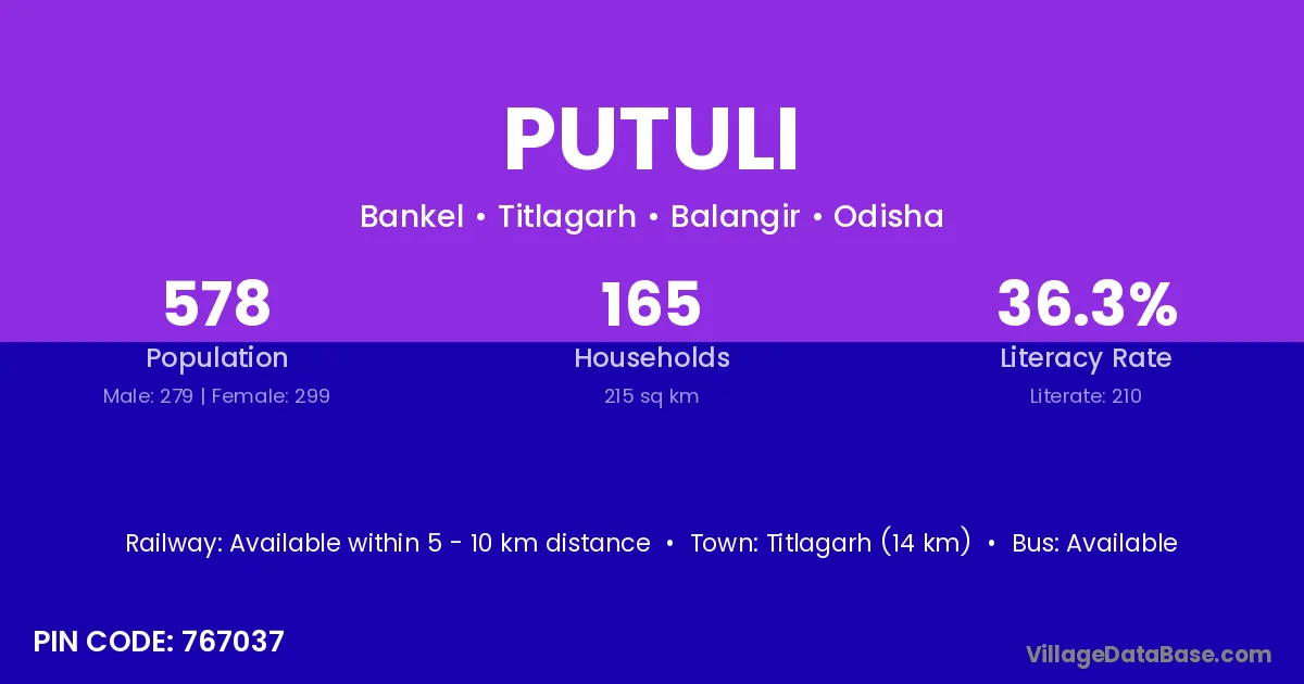 Titlagarh (14 km) is the nearest town to Putuli village for major economic activities and is located approximately 14 km away.