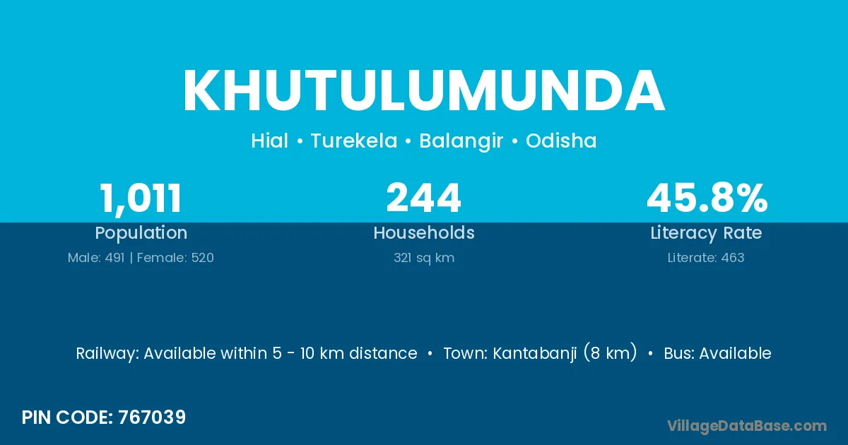 Khutulumunda village has a total population of 1,011 people, of which 491 are males and 520 are females.