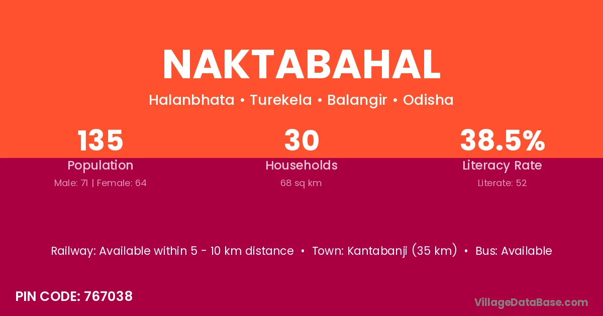 Naktabahal village has a total population of 135 people, of which 71 are males and 64 are females.