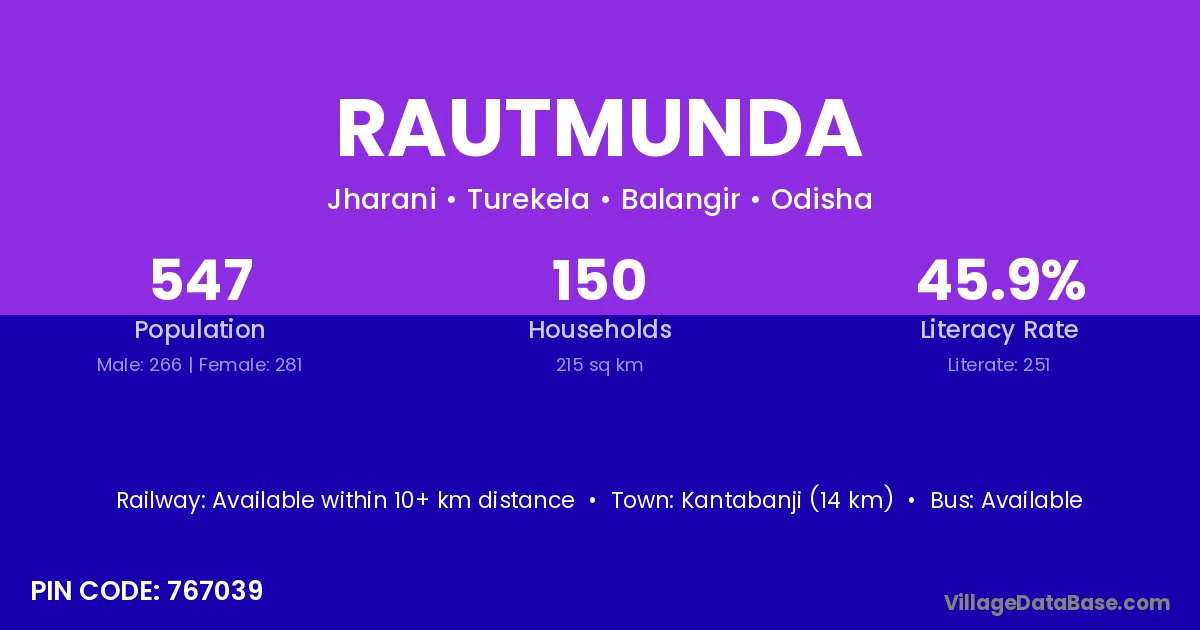 Kantabanji (14 km) is the nearest town to Rautmunda village for major economic activities and is located approximately 14 km away.