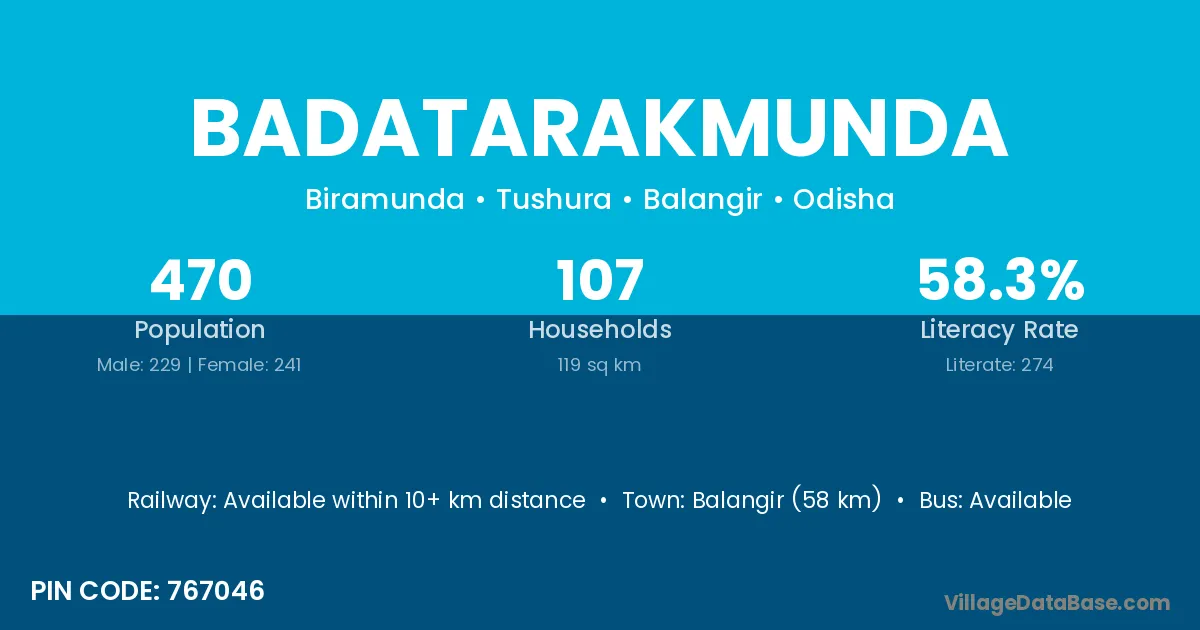 Balangir (58 km) is the nearest town to Badatarakmunda village for major economic activities and is located approximately 58 km away.