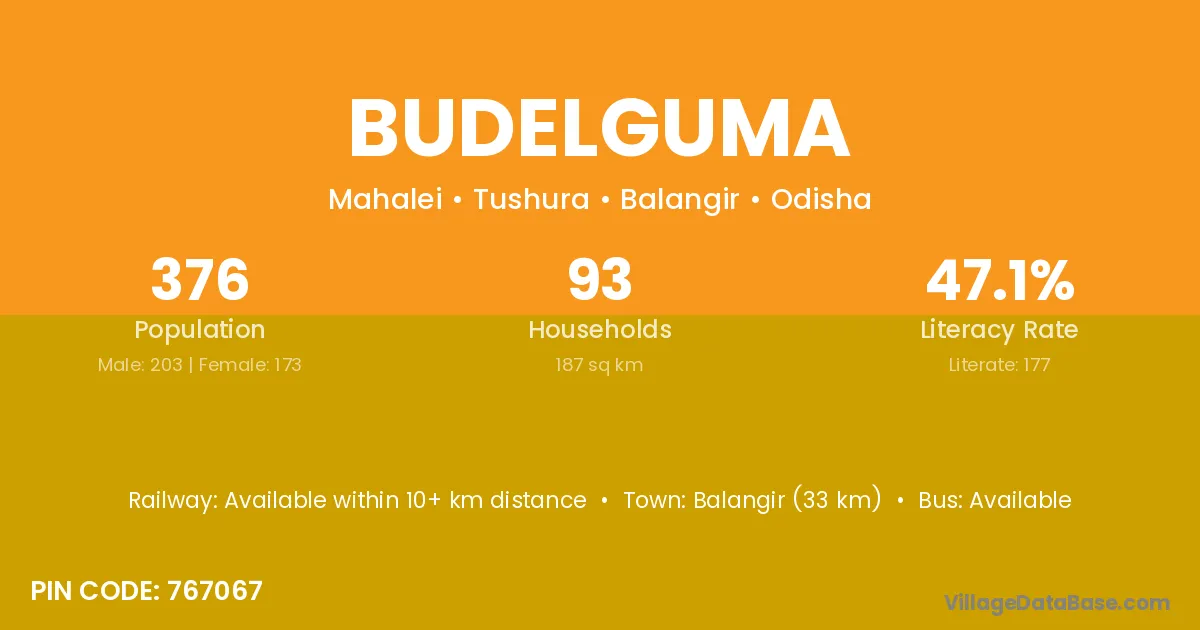 Balangir (33 km) is the nearest town to Budelguma village for major economic activities and is located approximately 33 km away.