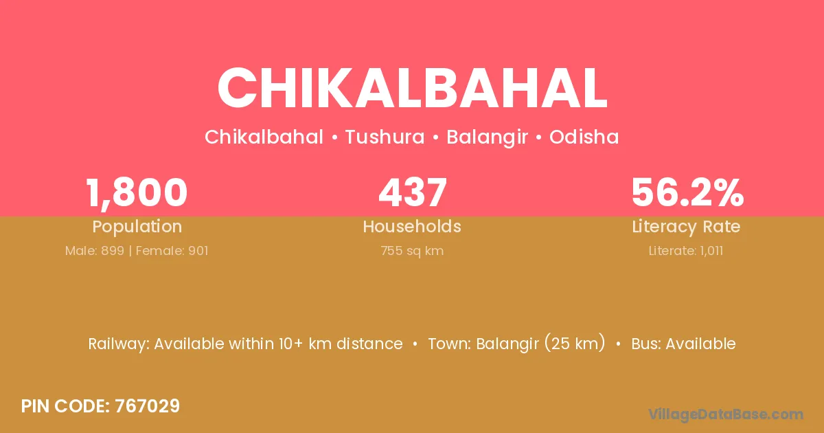 Balangir (25 km) is the nearest town to Chikalbahal village for major economic activities and is located approximately 25 km away.