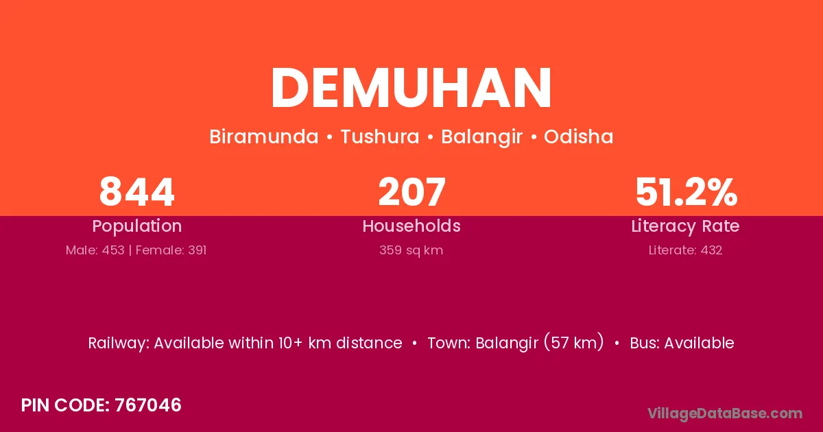 Balangir (57 km) is the nearest town to Demuhan village for major economic activities and is located approximately 57 km away.