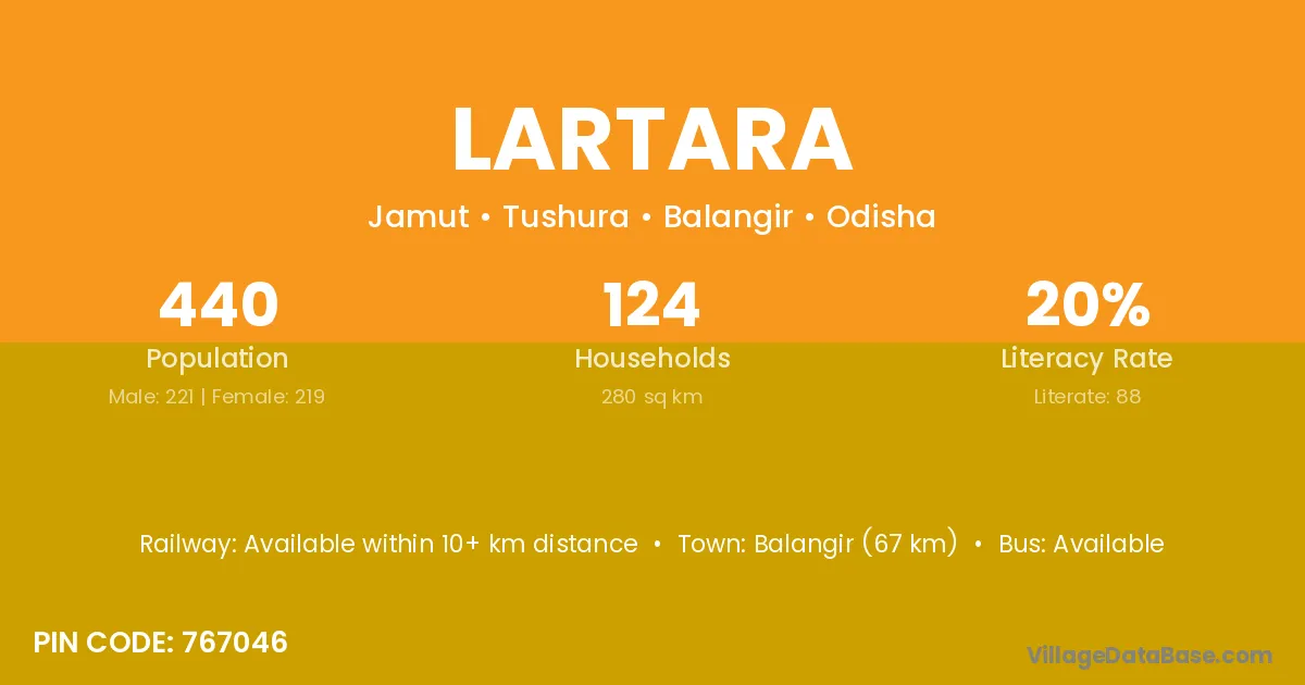 Balangir (67 km) is the nearest town to Lartara village for major economic activities and is located approximately 67 km away.