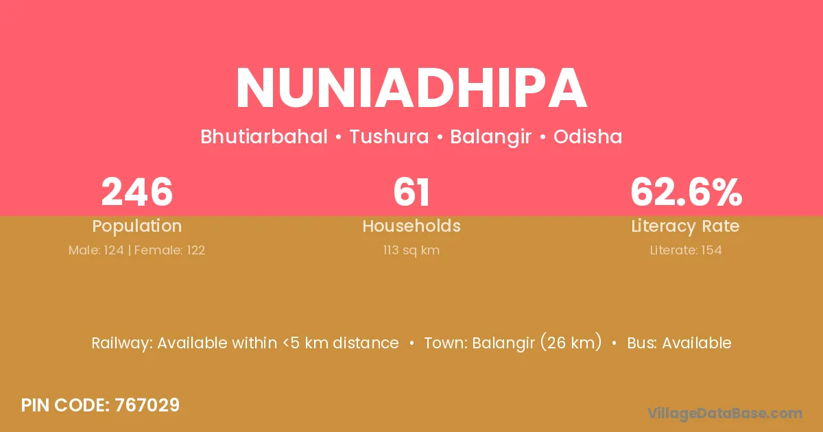 Balangir (26 km) is the nearest town to Nuniadhipa village for major economic activities and is located approximately 26 km away.