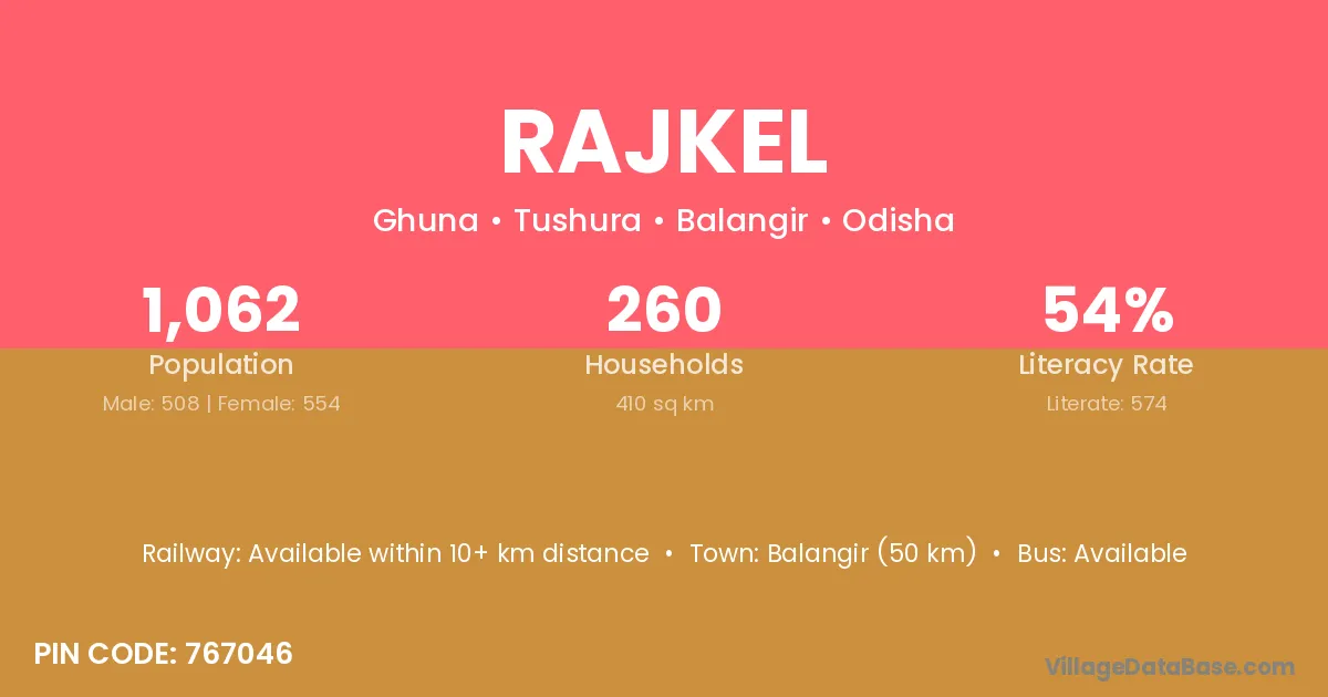Rajkel village has a total population of 1,062 people, of which 508 are males and 554 are females.