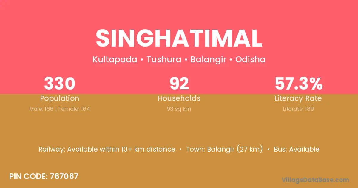 Singhatimal village has a total population of 330 people, of which 166 are males and 164 are females.