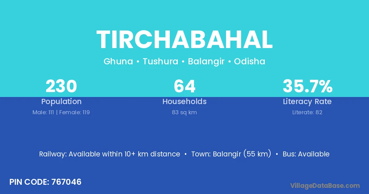 Balangir (55 km) is the nearest town to Tirchabahal village for major economic activities and is located approximately 55 km away.