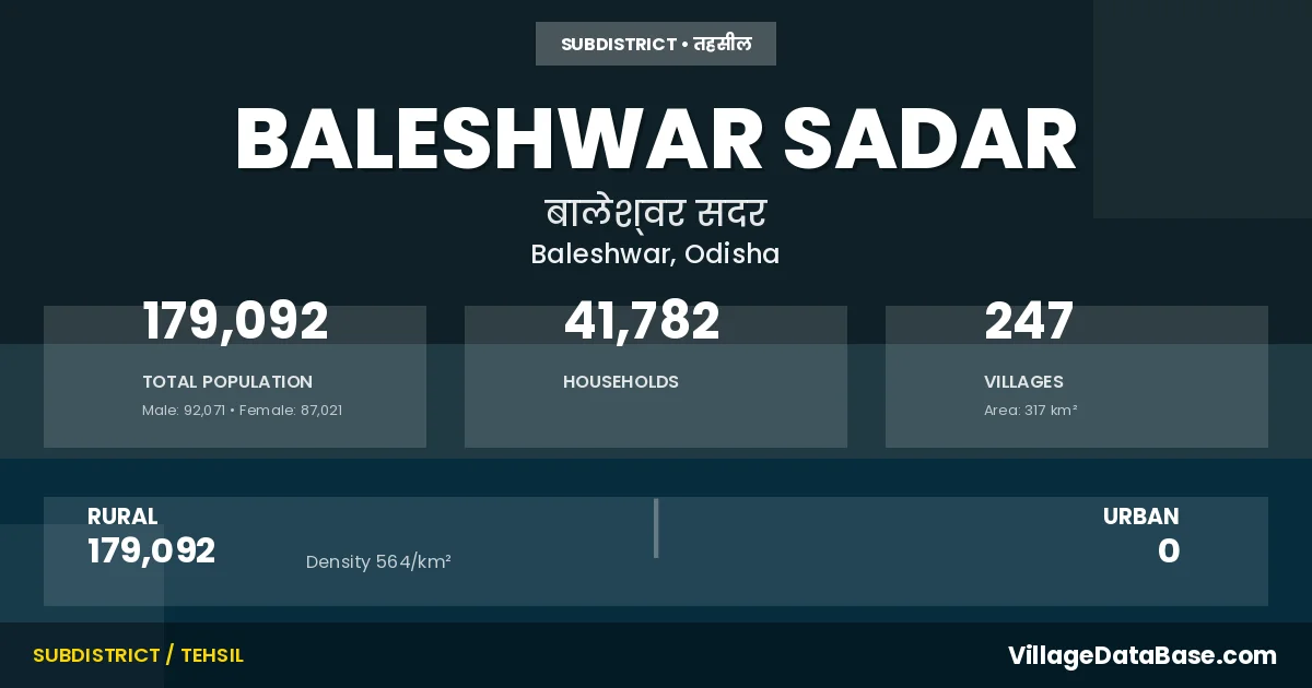 According to the 2011 census The total area of Baleshwar Sadar Tehsil is 317 km², with a population of 179092 people. The population density is 564 inhabitants per square kilometre, and there are approximately 41782 houses in the sub district.