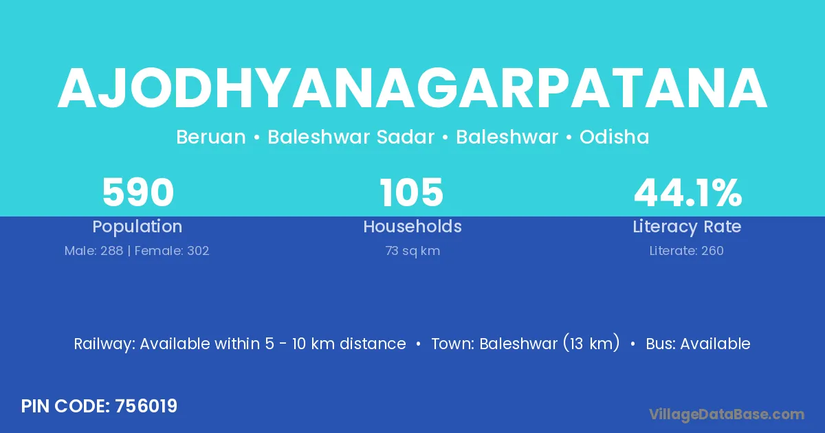 Baleshwar (13 km) is the nearest town to Ajodhyanagarpatana village for major economic activities and is located approximately 13 km away.