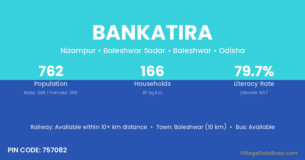 Baleshwar (10 km) is the nearest town to Bankatira village for major economic activities and is located approximately 10 km away.