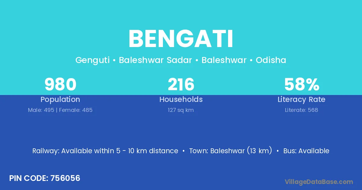 Baleshwar (13 km) is the nearest town to Bengati village for major economic activities and is located approximately 13 km away.