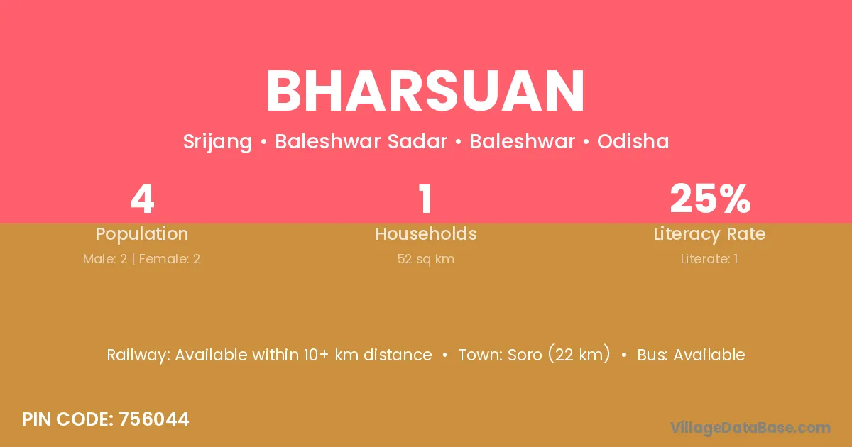Soro (22 km) is the nearest town to Bharsuan village for major economic activities and is located approximately 22 km away.