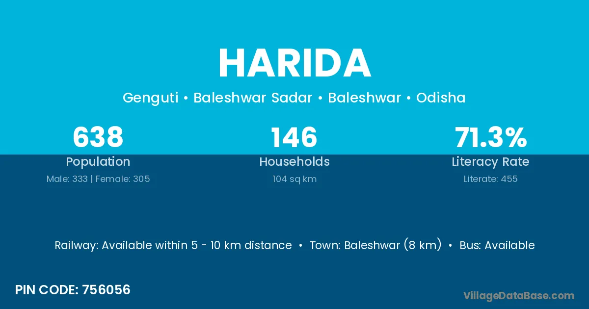 Baleshwar (8 km) is the nearest town to Harida village for major economic activities and is located approximately 8 km away.