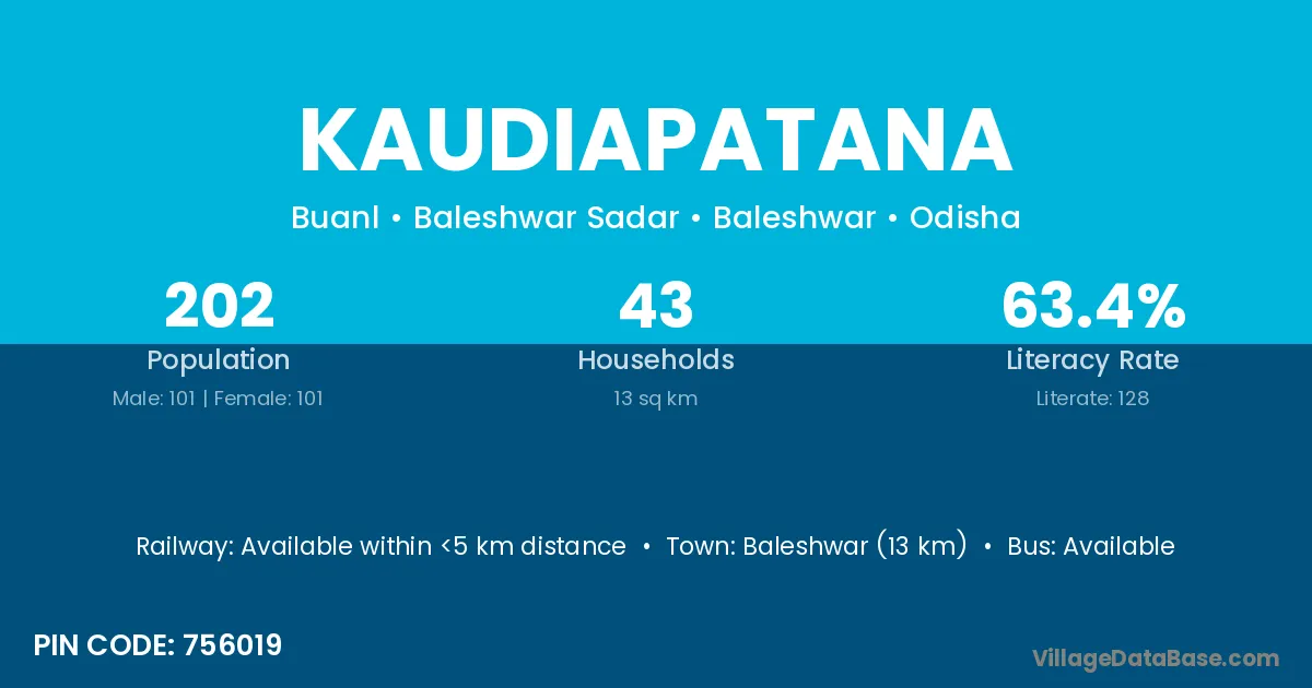 Baleshwar (13 km) is the nearest town to Kaudiapatana village for major economic activities and is located approximately 13 km away.