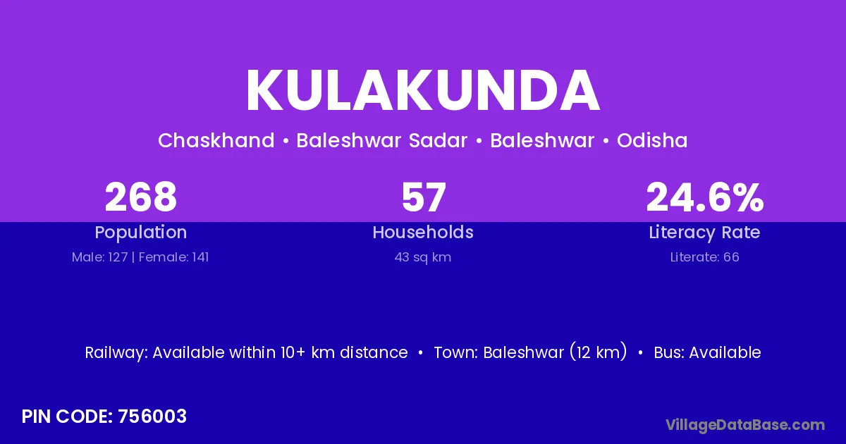 Baleshwar (12 km) is the nearest town to Kulakunda village for major economic activities and is located approximately 12 km away.