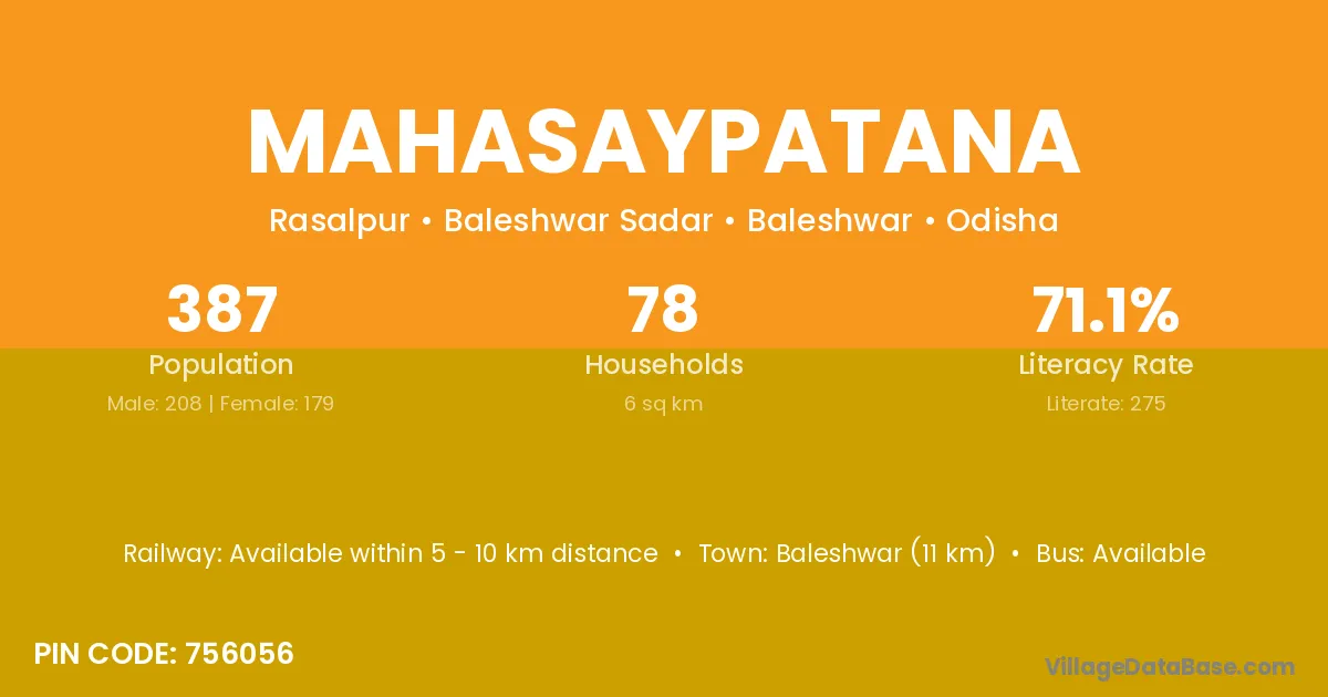 Baleshwar (11 km) is the nearest town to Mahasaypatana village for major economic activities and is located approximately 11 km away.