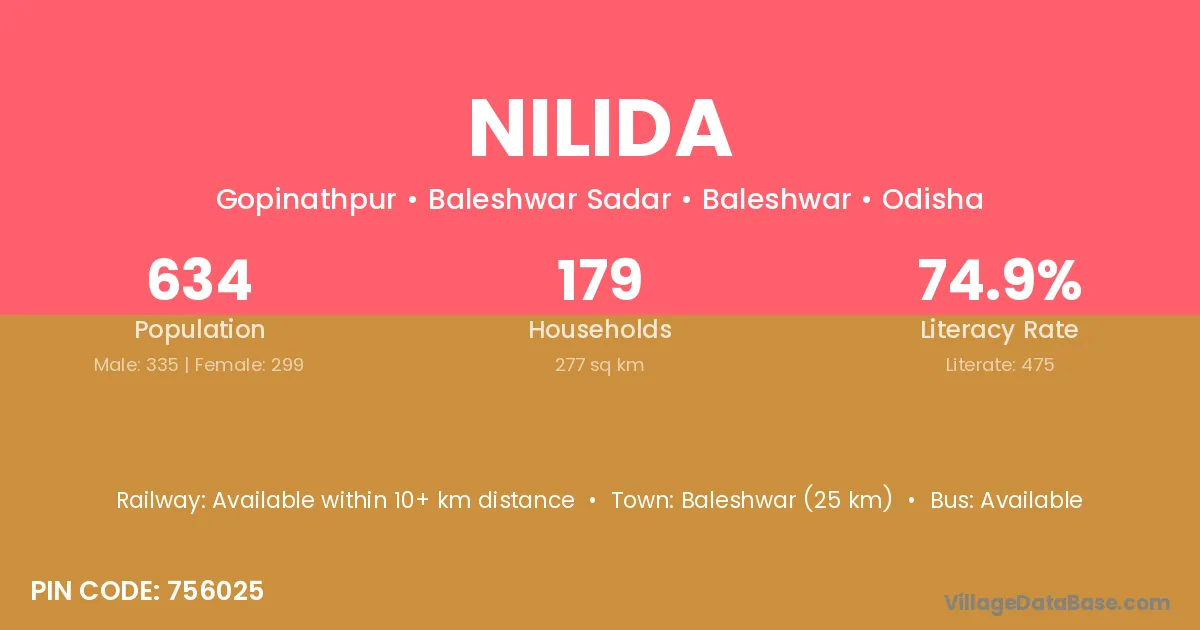 Baleshwar (25 km) is the nearest town to Nilida village for major economic activities and is located approximately 25 km away.